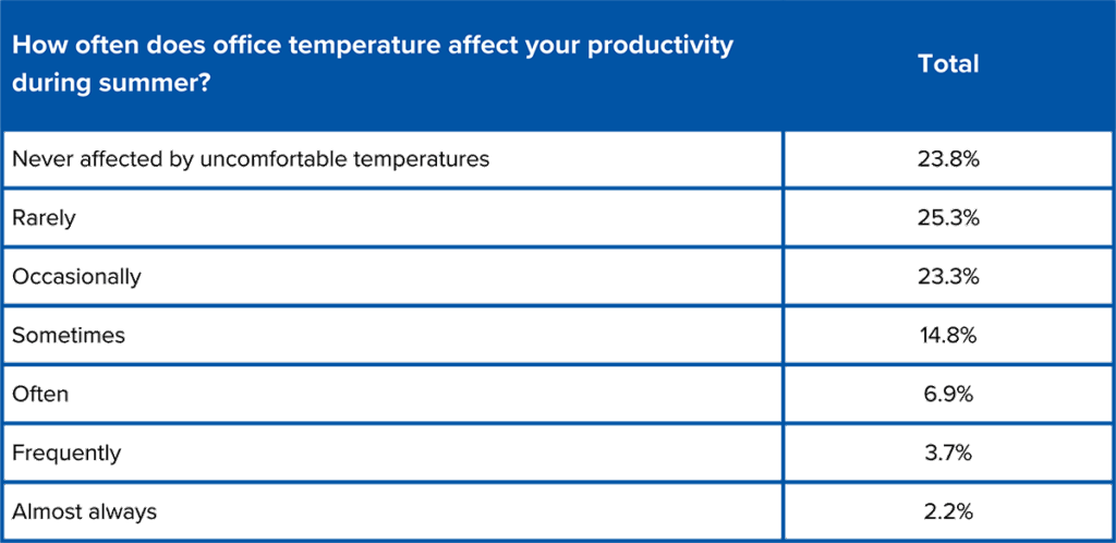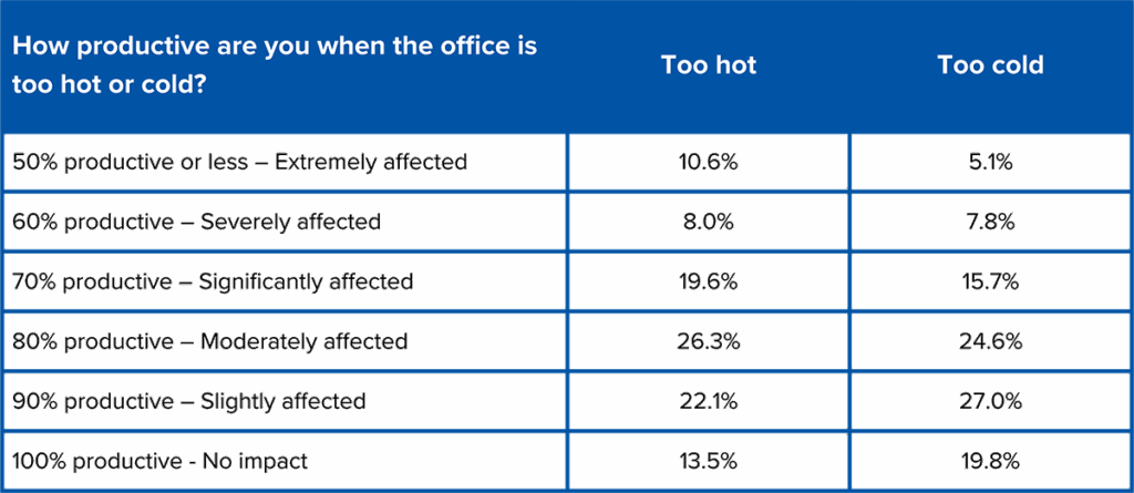 The survey shows that office heat has a stronger negative impact on productivity than cold. The most common response was that employees feel around 80% productive when it’s too hot (26.3%). For cold conditions, most respondents said they remained at least 90% productive (27%). Interestingly, over one in ten respondents (13.5% and 19.8%) reported that temperature, hot or cold, had no impact on their productivity.