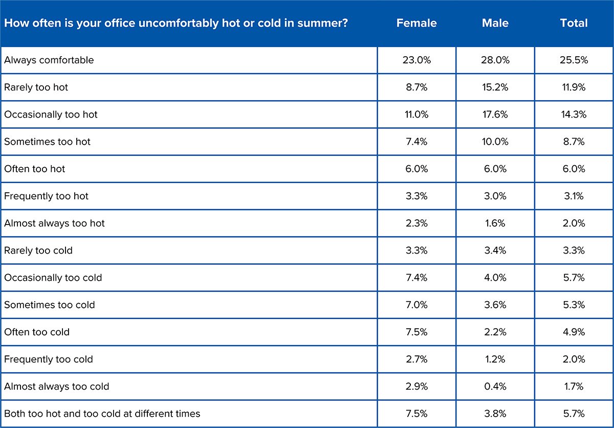 Heat is also a similar issue between men and women, with both experiencing roughly one hot day per five-day work week. Feeling cold, however, is more of a problem for women, who report the office being too cold on about 18% of summer workdays, compared to just 7% for men.