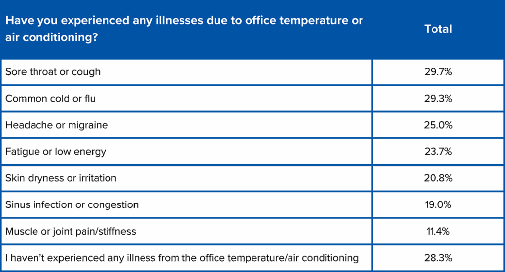 Office temperatures and air conditioning aren’t just a matter of comfort; they could also be making employees sick. Three in four (71.7%) report at least some symptoms they attribute to the office temperature or air conditioning, while only 28.3% of workers say they have not experienced any illness from it.